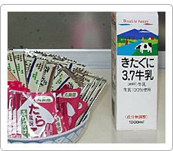おはようございます!朝日の差し込む食堂には入れたてのコーヒーと手作り朝食が待っています。あなたもどうぞ越路の朝ごはんを食べにきてください。朝食には牛乳、コーヒー、のり、ふりかけをご用意しております。ご自由におとりください。
